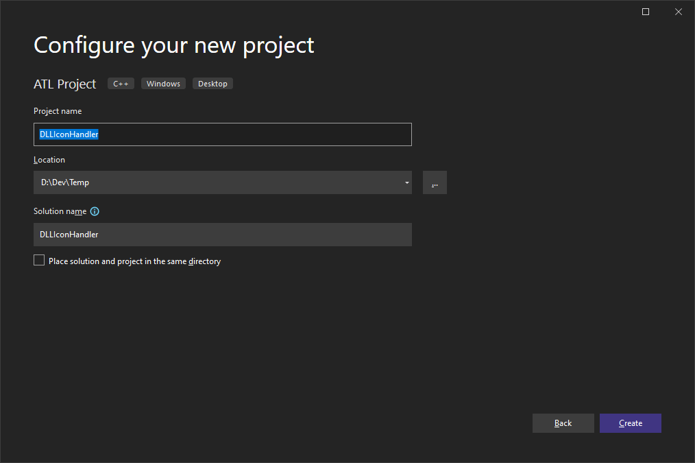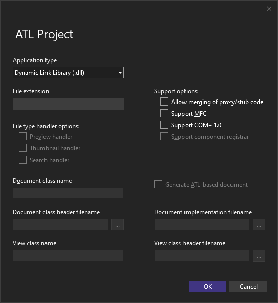 Click Create to launch the ATL project wizard. Leave all defaults (Dynamic Link Library) and click OK. Shell extensions of all kinds must be DLLs, as these are loaded by Explorer.exe. It’s not ideal in terms of Explorer’s stability, as aun unhandled exception can bring down the entire process, but this is necessary to get good performance, as no inter-process calls are made.