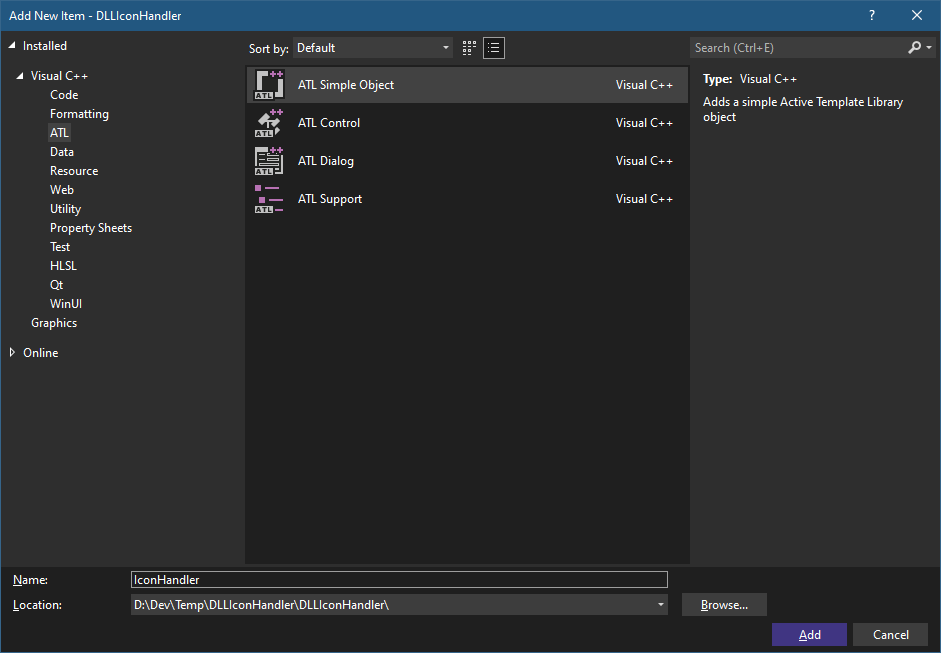 The next step is to add a COM class that will implement our icon handler. Again, we’ll turn to a wizard provided by Visual Studio that provides the fundamentals. Right-click the project and select Add Item… (don’t select Add Class as it’s not good enough). Select the ATL node on the left and ATL Simple Object on the right. Set the name to something like IconHandler: