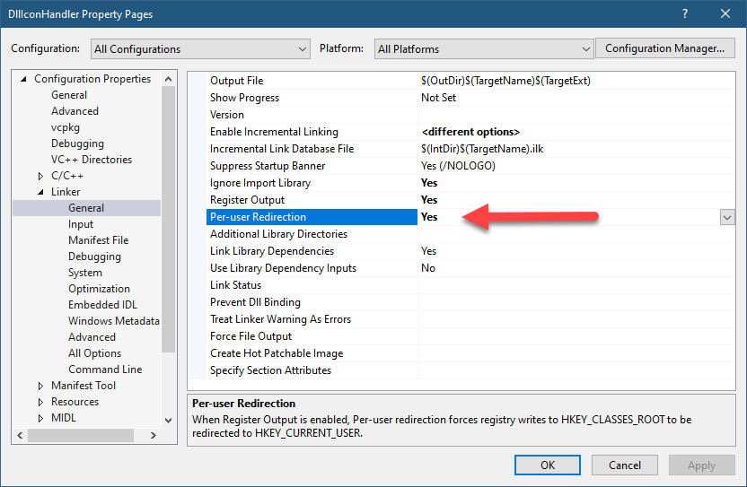 Replace your own CLSID if you’re building this project from scratch. Registration itself is done with the RegSvr32 built-in tool. With an ATL project, a successful build also causes RegSvr32 to be invoked on the resulting DLL, thus performing registration. The default behavior is to register in HKEY_CLASSES_ROOT which uses HKEY_LOCAL_MACHINE behind the covers. This requires running Visual Studio elevated (or an elevated command window if called from outside VS). It will register the icon handler for all users on the machine. If you prefer to register for the current user only (which uses HKEY_CURRENT_USER and does not require running elevated), you can set the per-user registration in VS by going to project properties, clinking on the Linker element and setting per-user redirection: