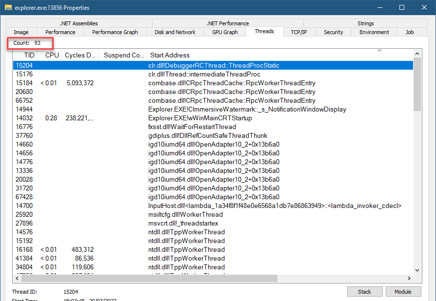 What are these threads doing, anyway? Let’s examine some processes. First, an Explorer.exe process. Here is the Threads tab shown in Process Explorer:
