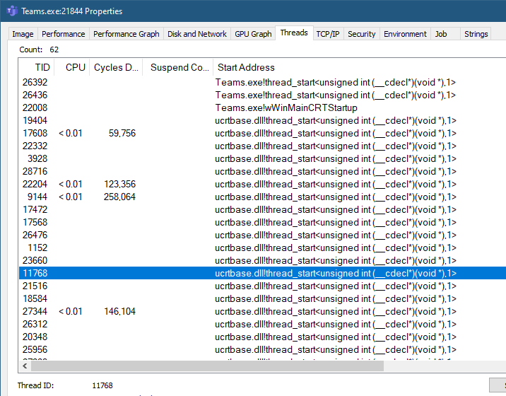 62 threads. Many have the same CRT wrapper for a thread created by Teams. Here are several call stacks I observed: